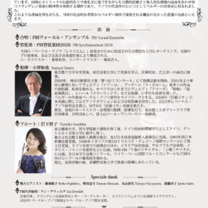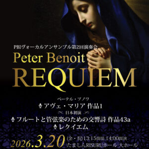 2026.01.30 【個人会員】ペーテル・ブノワ「レクイエム」日本初演演奏会のご案内 個人会員 白井幸子さんからのご案内です。 ベルギー・近代フランドル音楽の父、ペーテル・ブノワの「レクイエム」を日本初演いたします。 是非お越しください。 チラシを見る 日時2026年3月20日(金・祝)14:00開演(13:15開場) 会場たましんRISURUホール(東京都立川市錦町3-3-20) https://risuru.hall-info.jp/access/ 料金3,000円(全席自由) チケットご購入チケットぴあ:http://ticket.pia.jp/pia/event.ds?eventCd=2542128 ※未就学児童の入場はご遠慮いただいております